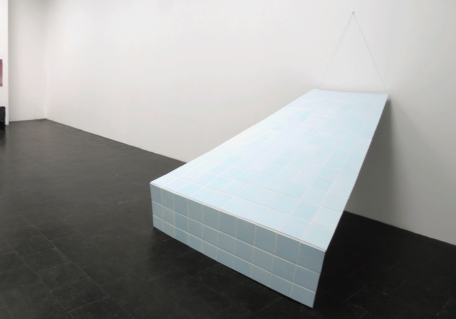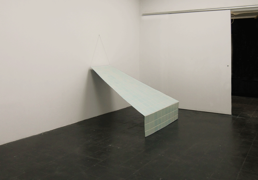 A front view reveals a massive object made of what appear to be tiles. It hangs, however, from a rather fragile string on a nail and is slightly separated from the wall. A side view reveals its extreme thinness. The mirrored surface underneath reflects the surrounding space conveying a sense of insubstantiality. The work plays thus with weight and lightness, volume and flatness, objectness and spatiality, painting and sculpture.