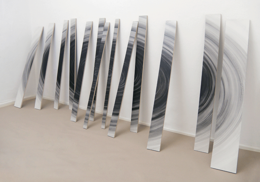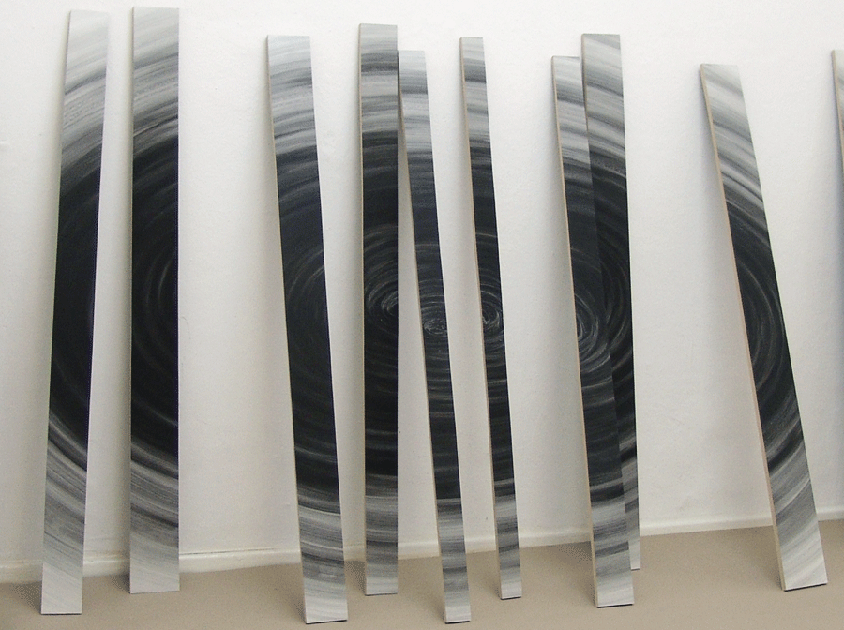 M2 (Black Hole) is about the visual effect that occurs when the eye aims at completing the broken circular movements. The intentionally uneven ordering of the elements produces an effect of depth and three-dimensionality that reminds of a galactic constellation and contrasts with the concreteness and flatness of the object under display.
